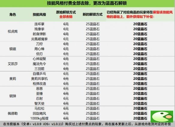 技能风格付费将在下个版本全部去除,更改为蓝晶石解锁(蓝晶石可以在战斗结算时获取)。