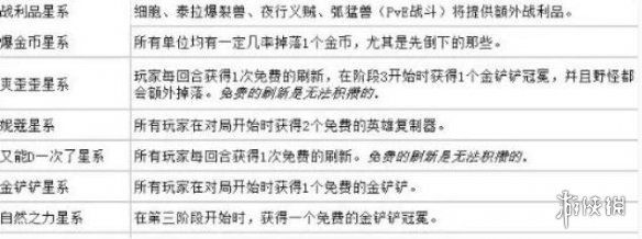 3、爽歪歪星系:每回合获得1次免费的刷新,阶段3开始时获得1个金铲铲冠冕,野怪会额外掉落。