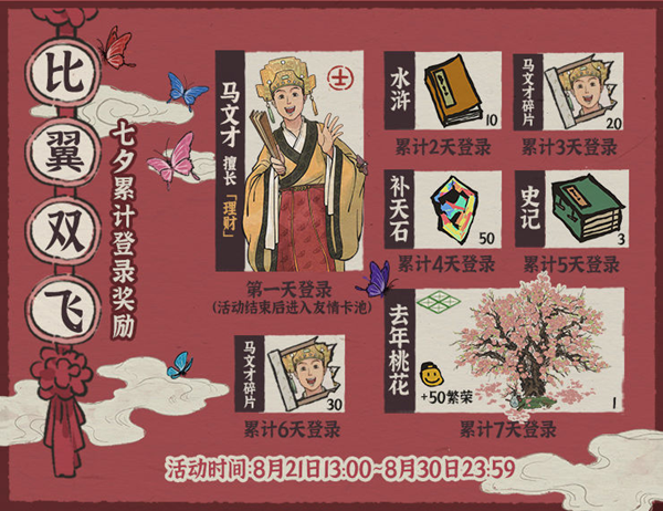 每日登录即可免费领取士级新角色【马文才】、补天石、书籍、全新建筑【去年桃花】等好礼~