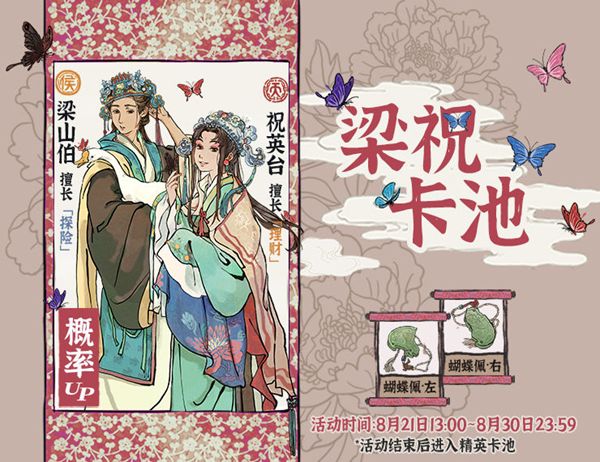 天级新角色【祝英台】&侯级新角色【梁山伯】、新珍宝【蝴蝶佩·左】&【蝴蝶佩·右】共同进入【梁祝】卡