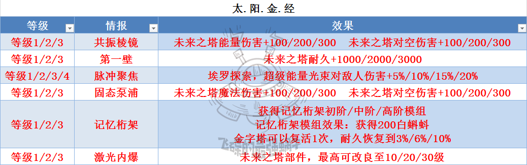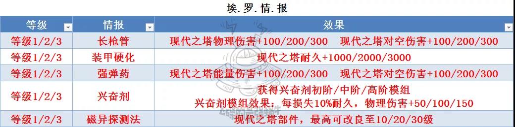 关于金字塔改造,通过升级情报使金字塔获得增强,相关情报和其效果如图所示: