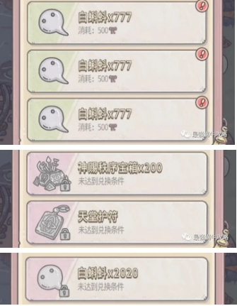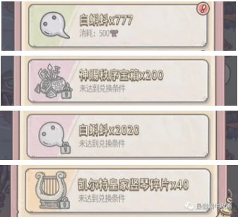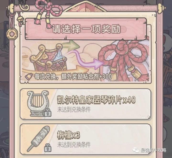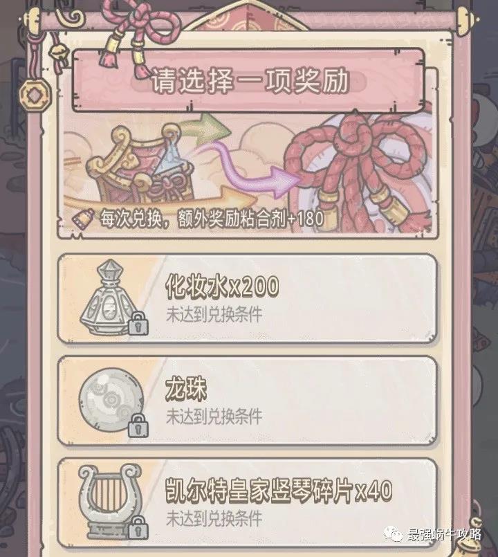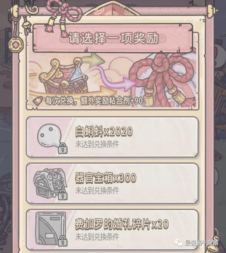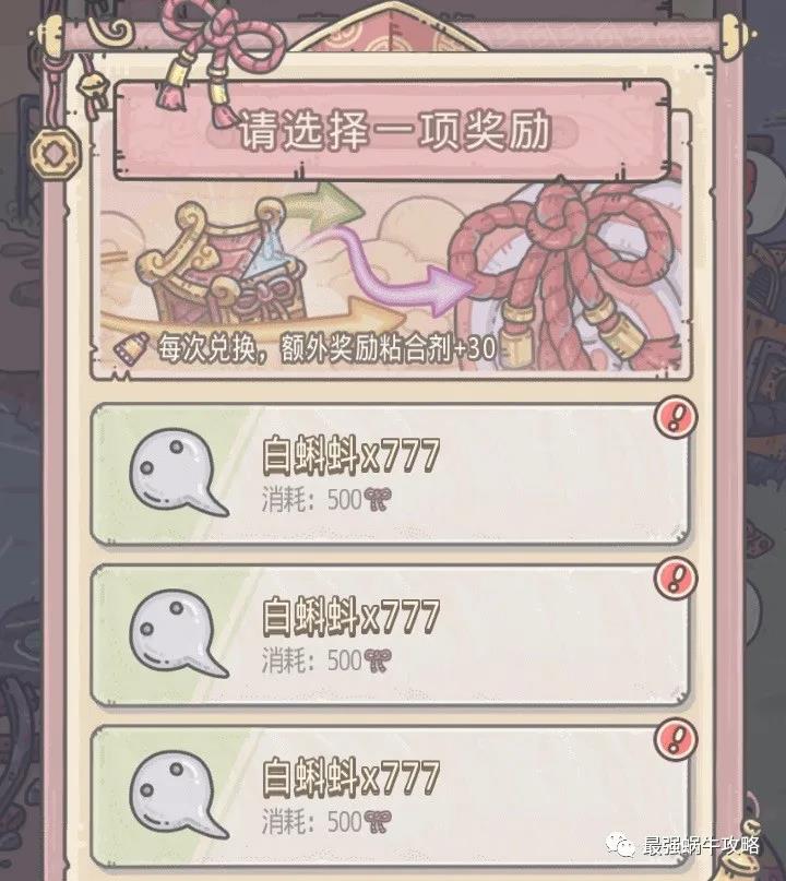 第一档:消耗500红绳,兑换任意奖项后获得30粘合剂,【建议】如果其他档次不合你胃口建议兑换本档硬通货白蝌蚪X777