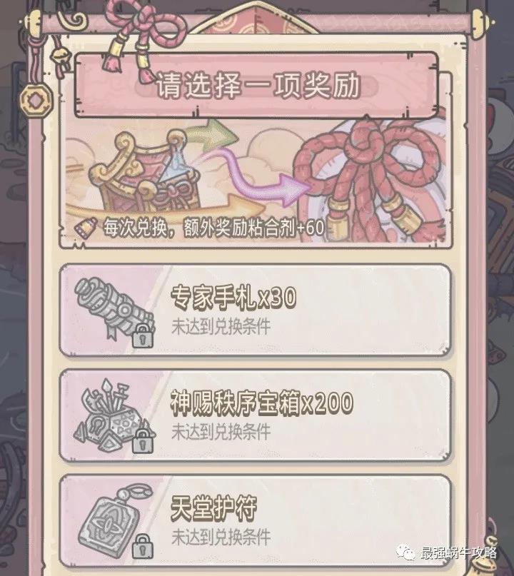 第二档:消耗1000红绳,兑换任意奖项后获得60粘合剂【建议】如果不缺天堂护符就我个人而言,会兑换神赐秩序宝箱