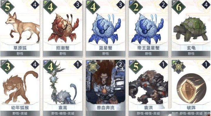 开局尽量刷出【猿洪】,然后积极【吞噬】野性卡牌,来触发核心卡【猿洪】的【白猿舍利】。【猿崇】就是一个进化【猿猴】的工具人,让【野性狐猴】的战力从3点进化为落地直接8点战力的【狐猴壮士】,提供更好的生存能力。【招潮蟹】与【蓝星蟹】的用法都是互相【吞噬】来获得额外的战力点数+3,【蓝星帝王蟹】能够更好的提供野性牌用以吞噬,【玄龟】的特性在这个卡组里面还是很好的防御担当。利用卡牌的吞噬建立优势把场面控制住,最后找时机释放传说牌【兽血奔流】来暴增总战力,带走对手!