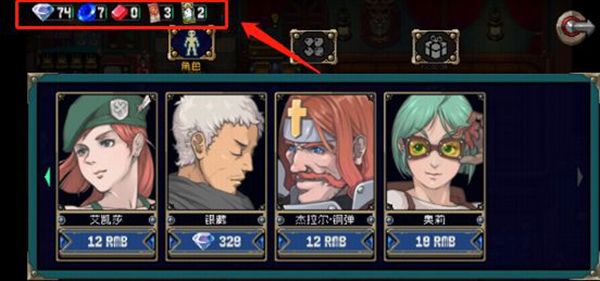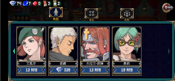 点击页面右侧的购物车按钮,进入【商店】,可购买角色、宝石、礼包