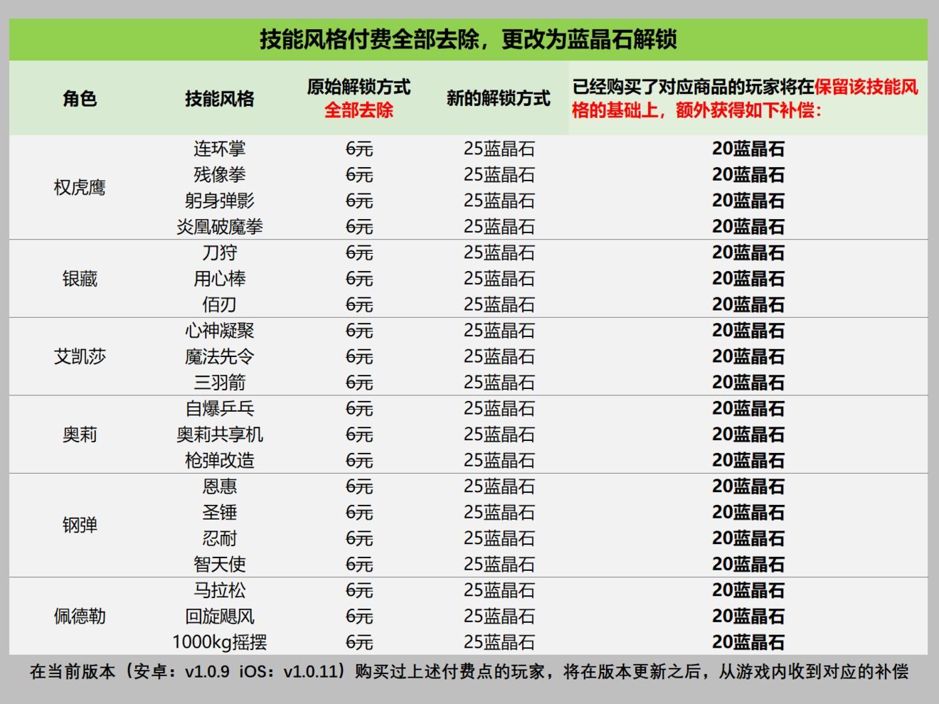技能风格付费将在下个版本全部去除,更改为蓝晶石解锁(蓝晶石可以在战斗结算时获取)。