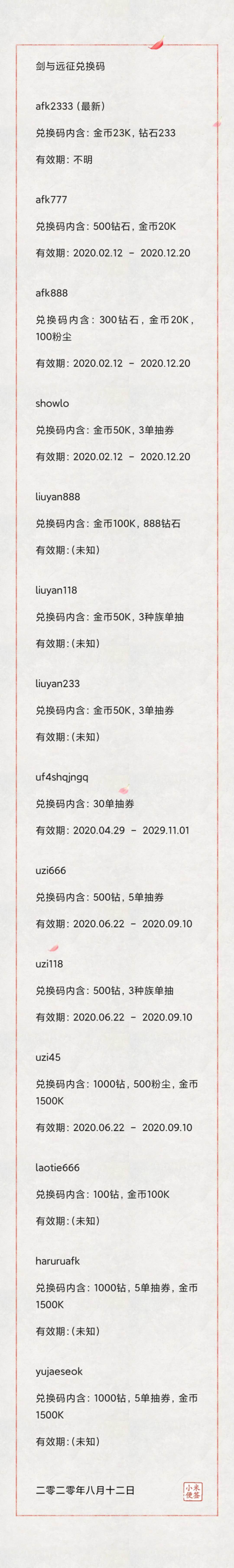 剑与远征8月20日兑换码大全;