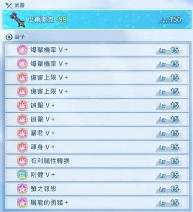 除必备因子,其他因子选用方面都是只插1颗,目前因子CP值最高都是在15等有最高效益,塞满等级的效益会大降,追击只使用2颗到74%机率,放弃一颗增加生存因子,战斗中会更顺利。