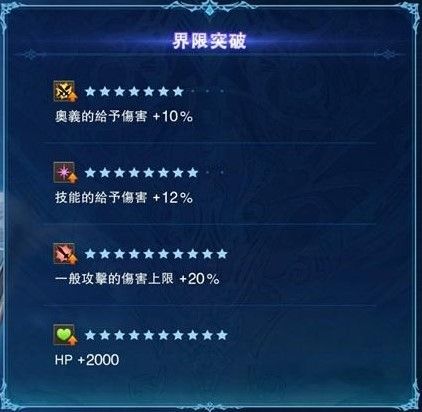 限界突破还没有洗到很完美,一般攻击上限一定要20%,另一个我会优先选HP+2000,再来会选择爆率20%(有的话能节省一格爆击机率)